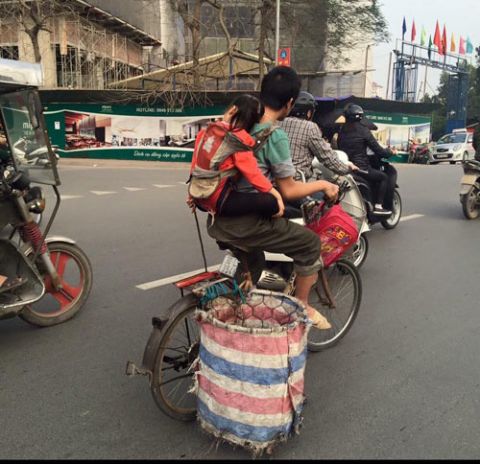 vào vai cha ngủ ngon lành, chiếc cặp đi học hồng xinh treo phía tay lái,